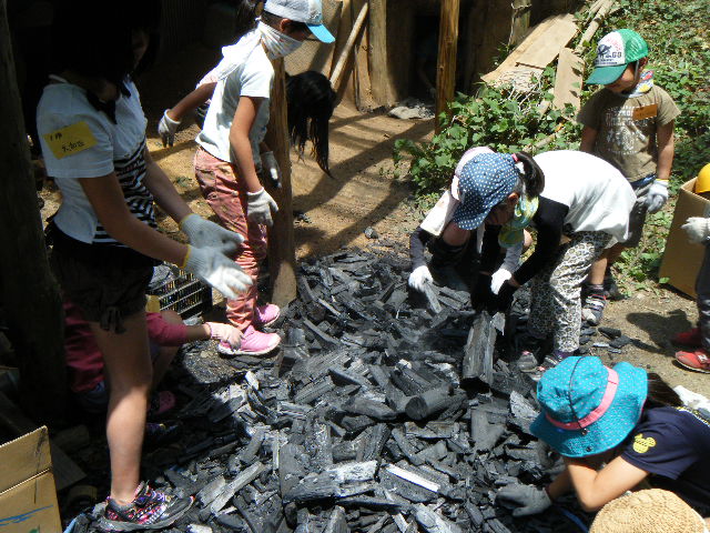 スミ焼き体験では、スミ釜へ原料の木を入れるのに入り口の狭さに子どもたちも苦労して