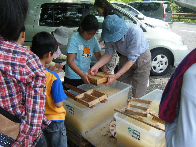紙漉きはいつもの宮地のオンちゃんご夫妻。紙の原料などの説明もあり、少しエコな気分にもなりました。さすがです!