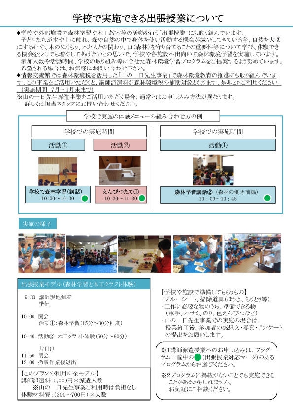 情報交流館では今年度も森林環境税を活用した「山の一日先生事業」を実施して森林環境教育の推進を行います。