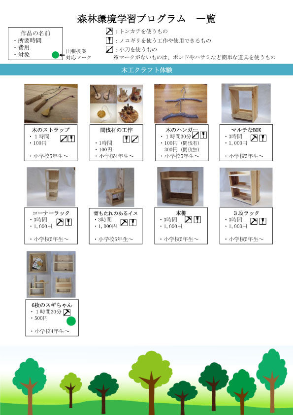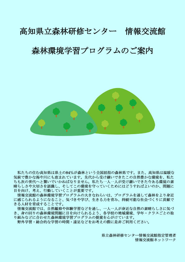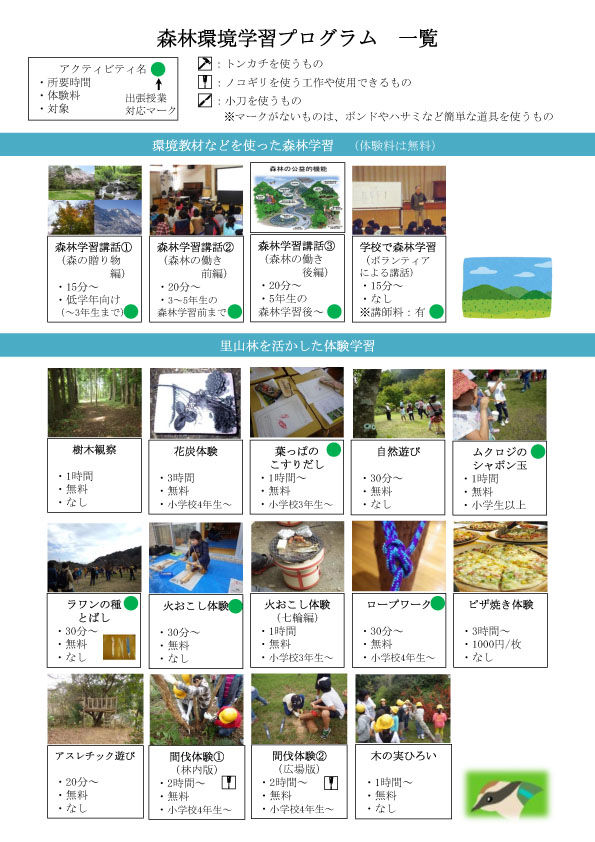 昨今、子どもたちが木や土に触れ、森や自然の中で身体を使い活動する機会が少なくなっていると言われておりますが、当館では人数や活動時間、学校やクラスごとの取り組み等に合せた森林環境学習プログラムをご提供するよう努めています。この事業では講師派遣の費用が森林環境税の補助となりますので、是非ともご利用ください。