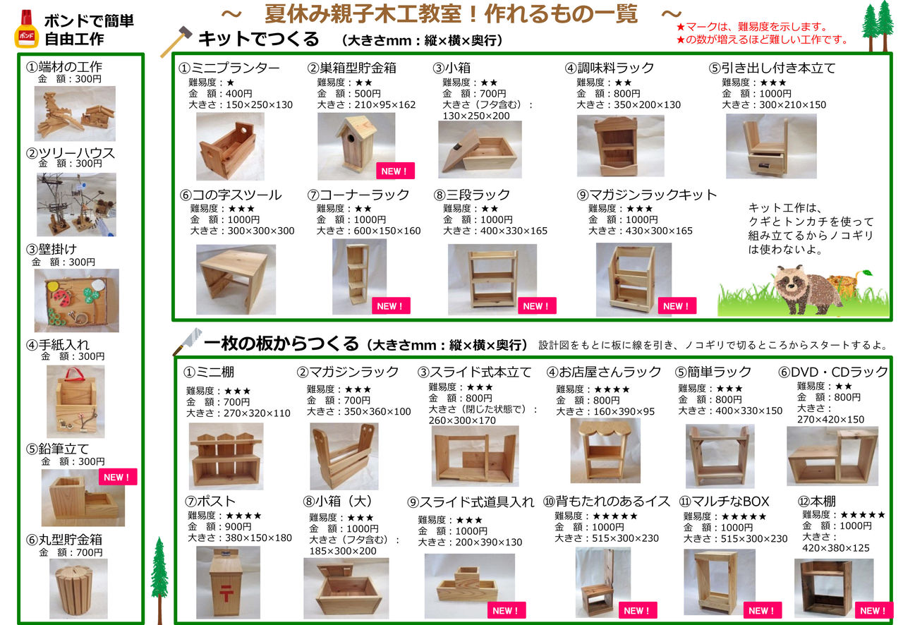 「夏休み親子木工教室」 作れるもの一覧 ページです。