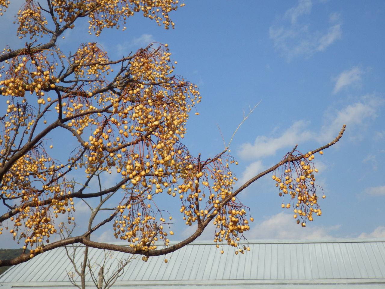 一昨日まで枝が折れそうなくらいにどっさり実がついていたセンダン。