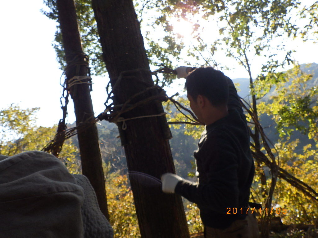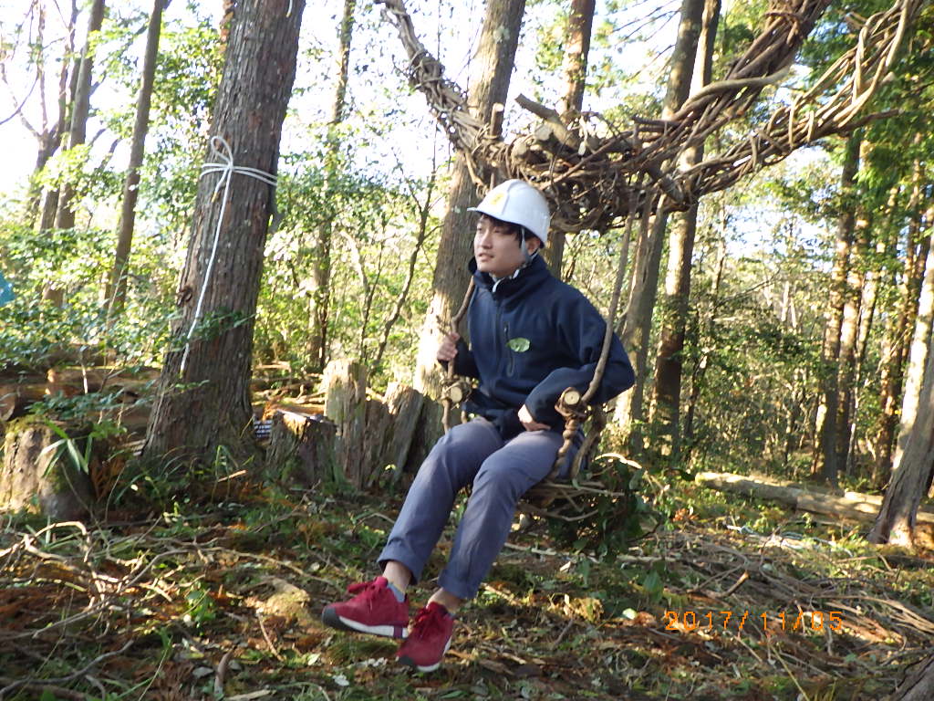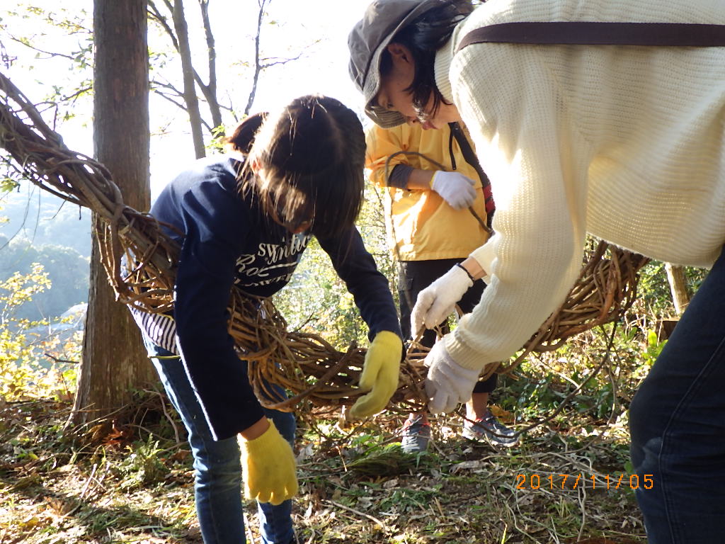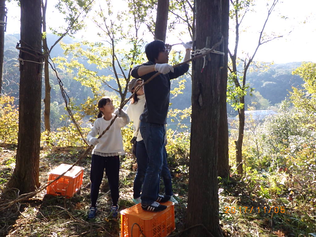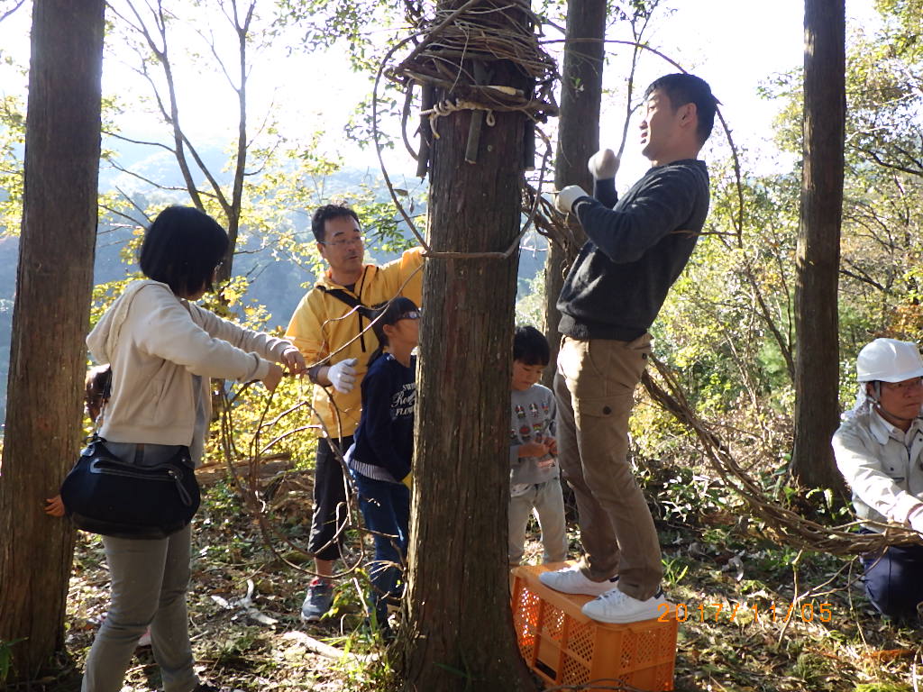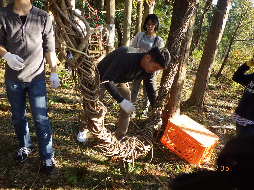 5家族17名と高知工科大学のワベールという団体の学生7名が来てくれ、みんなで森に入りカズラをあつめて来て、スギ林の中に作りました!