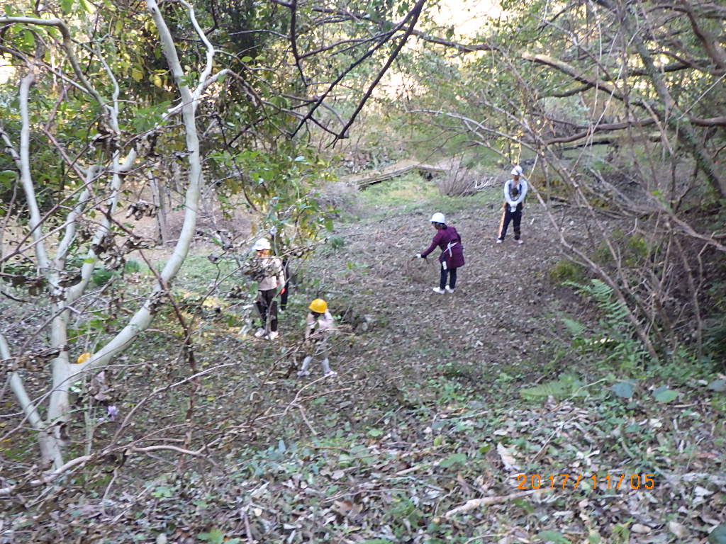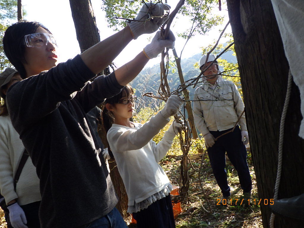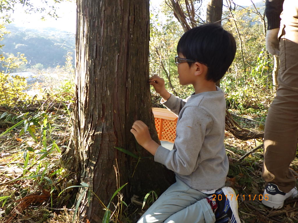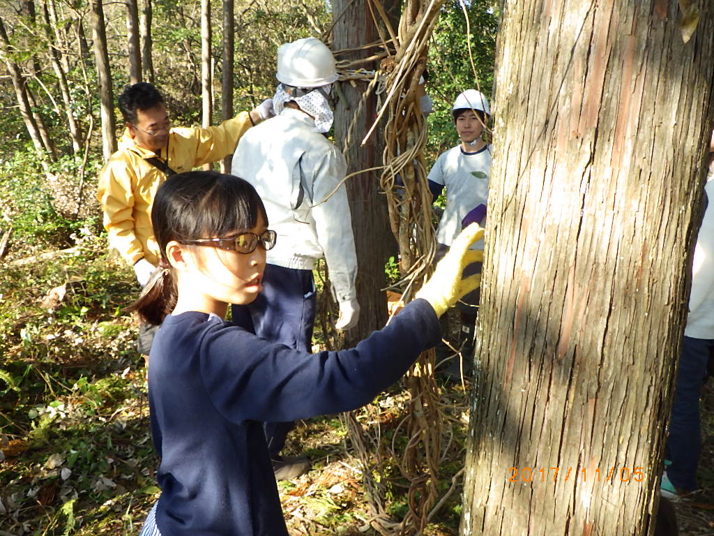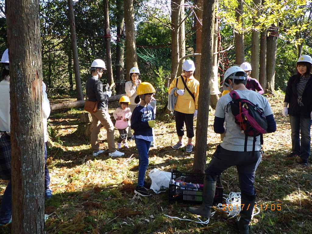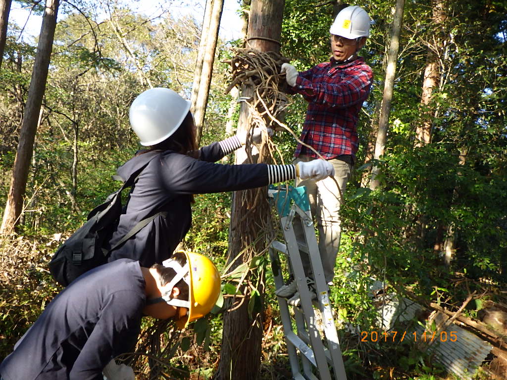 5家族17名と高知工科大学のワベールという団体の学生7名が来てくれ、みんなで森に入りカズラをあつめて来て、スギ林の中に作りました!