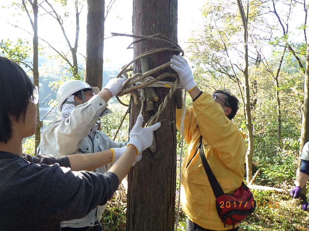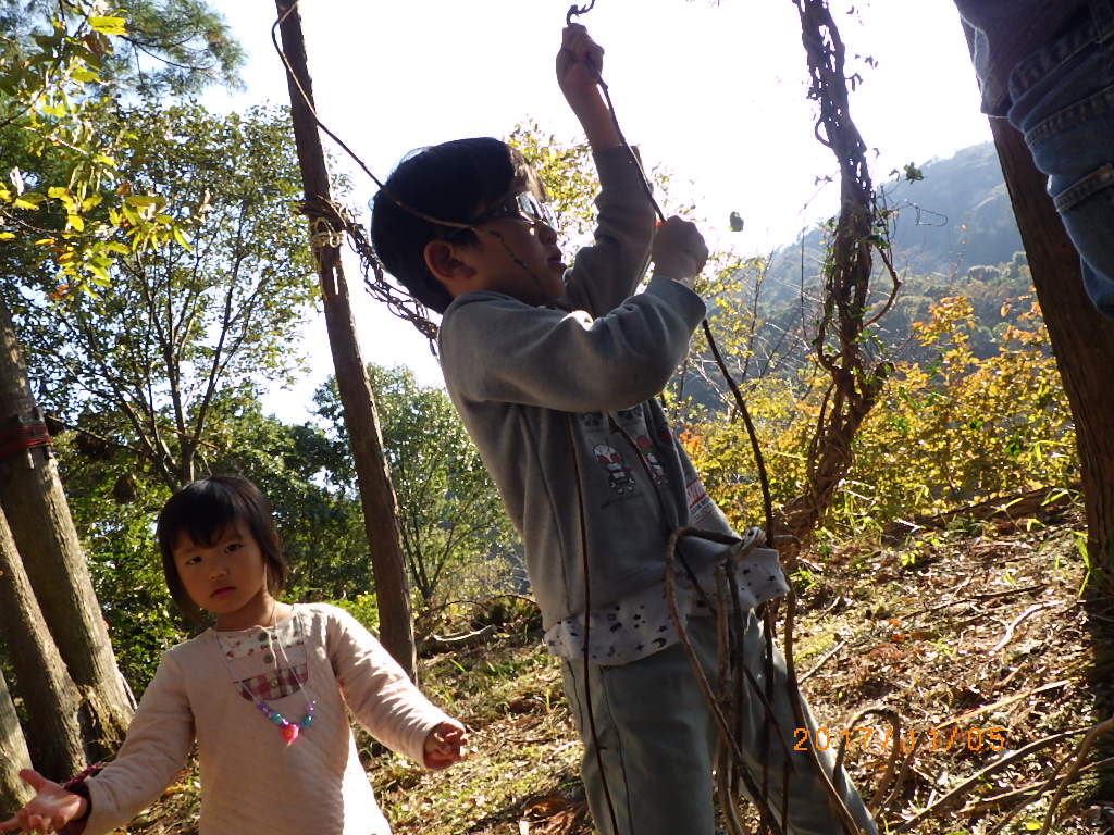 よいしょ!よいしょ!とカズラをひっぱったり、みんなでどうやったら強度がでるだろうとワイワイ言いながら、また学生さんが子どもたちの安全を見てくれたり、楽しく協力してできました^^