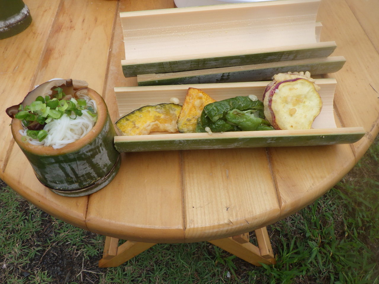 竹で食器も作っておいしいおそうめんやてんぷらなどをいただきました。