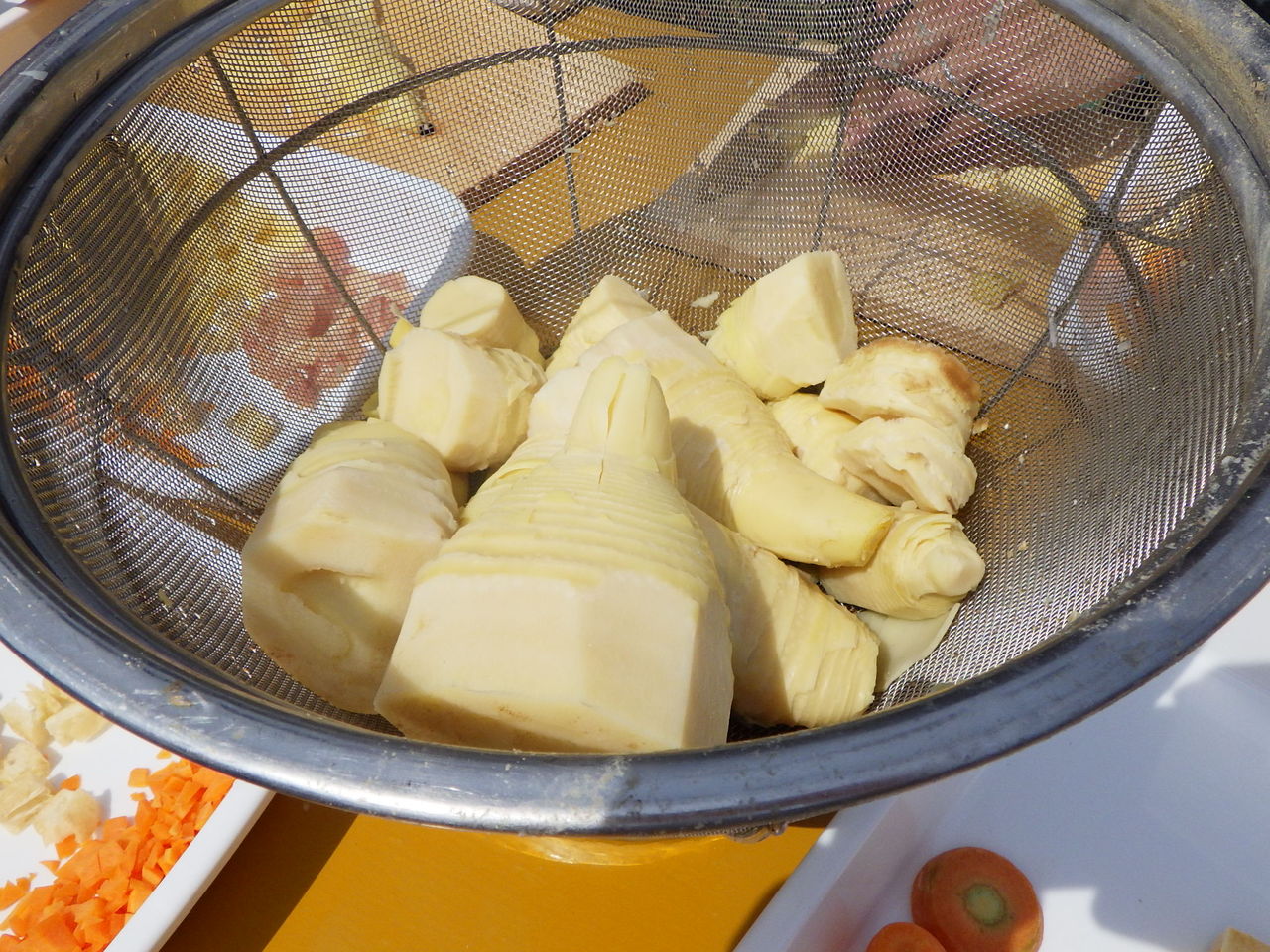 お次は、タケノコご飯の準備。皮をはいでぐらぐらのお湯でゆでて、食材を切って、