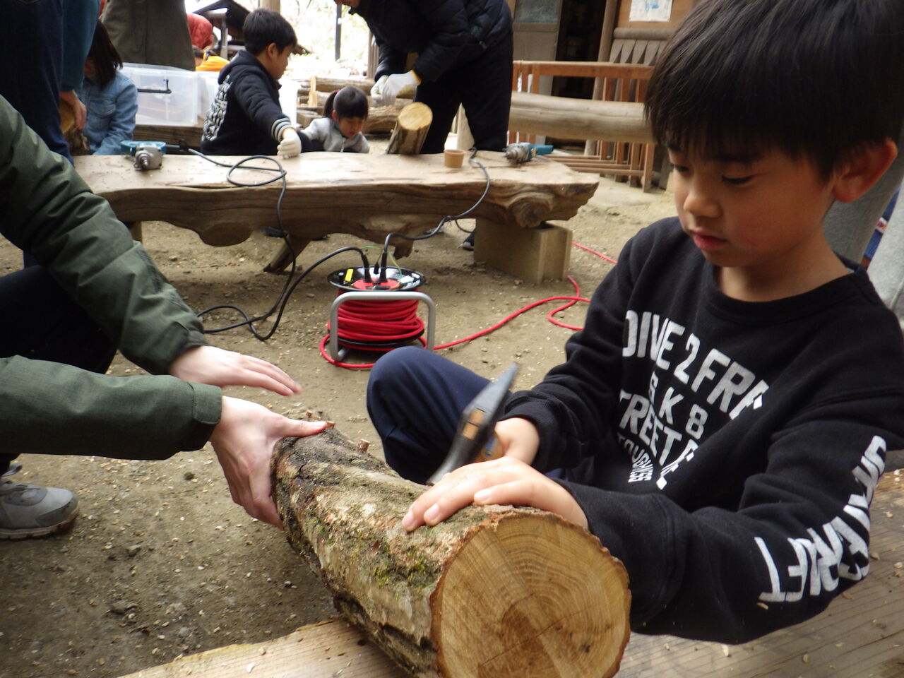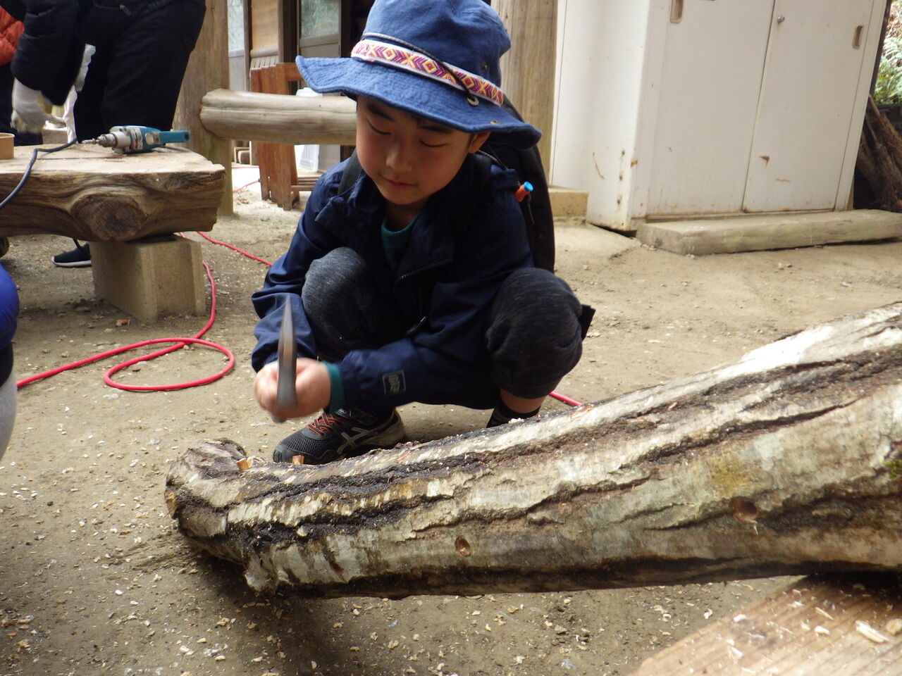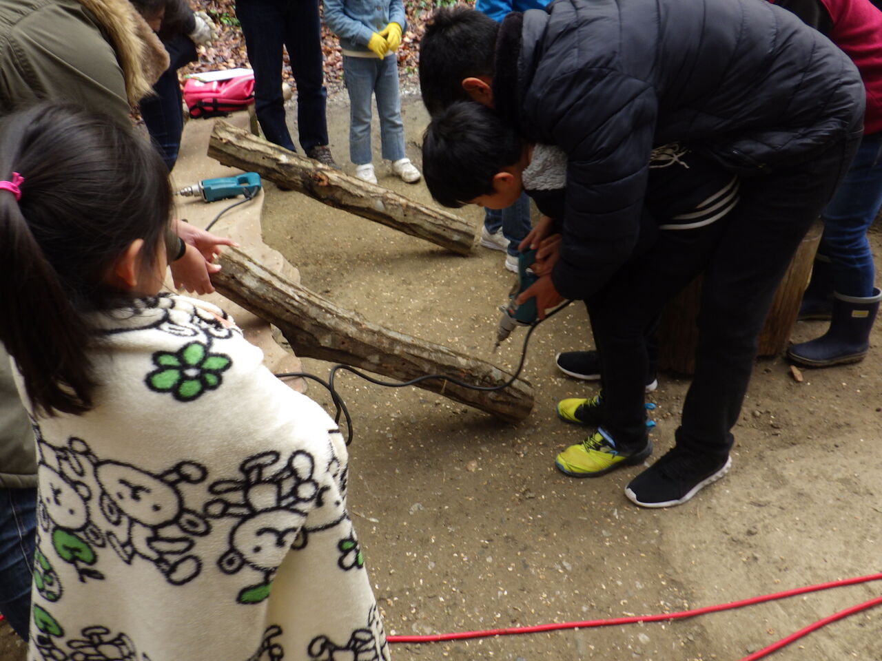 はじめにきのこの会代表の和田さんから、注意事項や駒うちの仕方、きのこについてのお話を聞いて、ドリルで穴をあけてシイタケ菌の駒を打ち込みました。