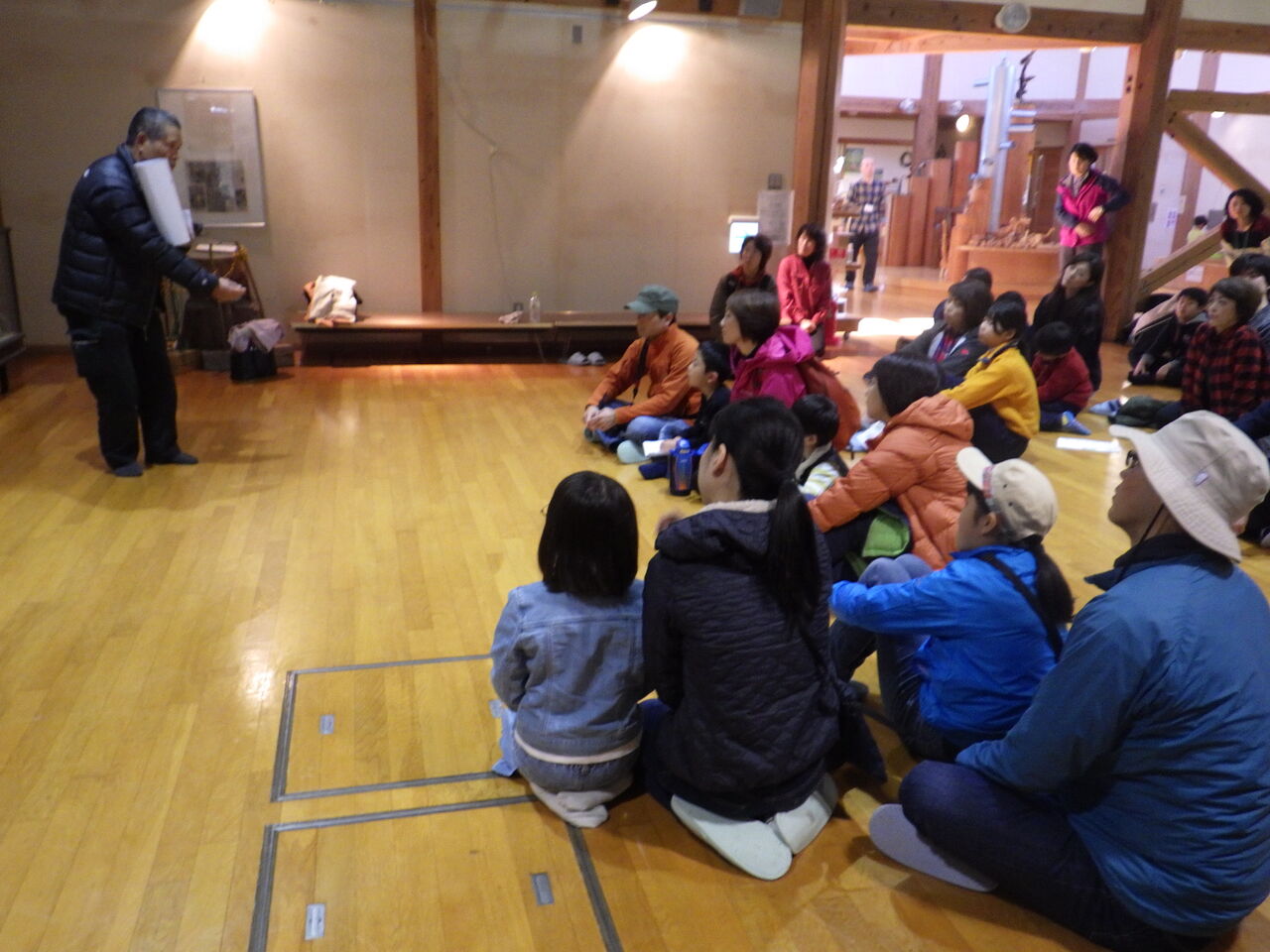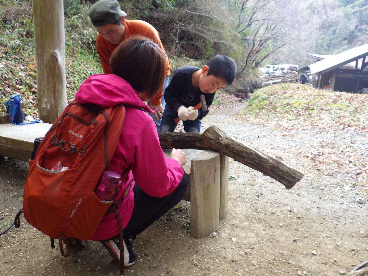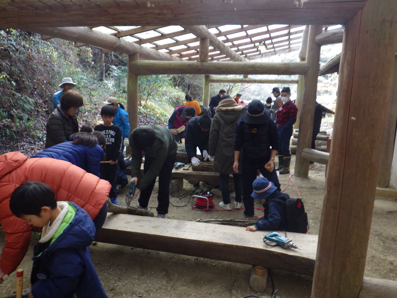 はじめにきのこの会代表の和田さんから、注意事項や駒うちの仕方、きのこについてのお話を聞いて、ドリルで穴をあけてシイタケ菌の駒を打ち込みました。
