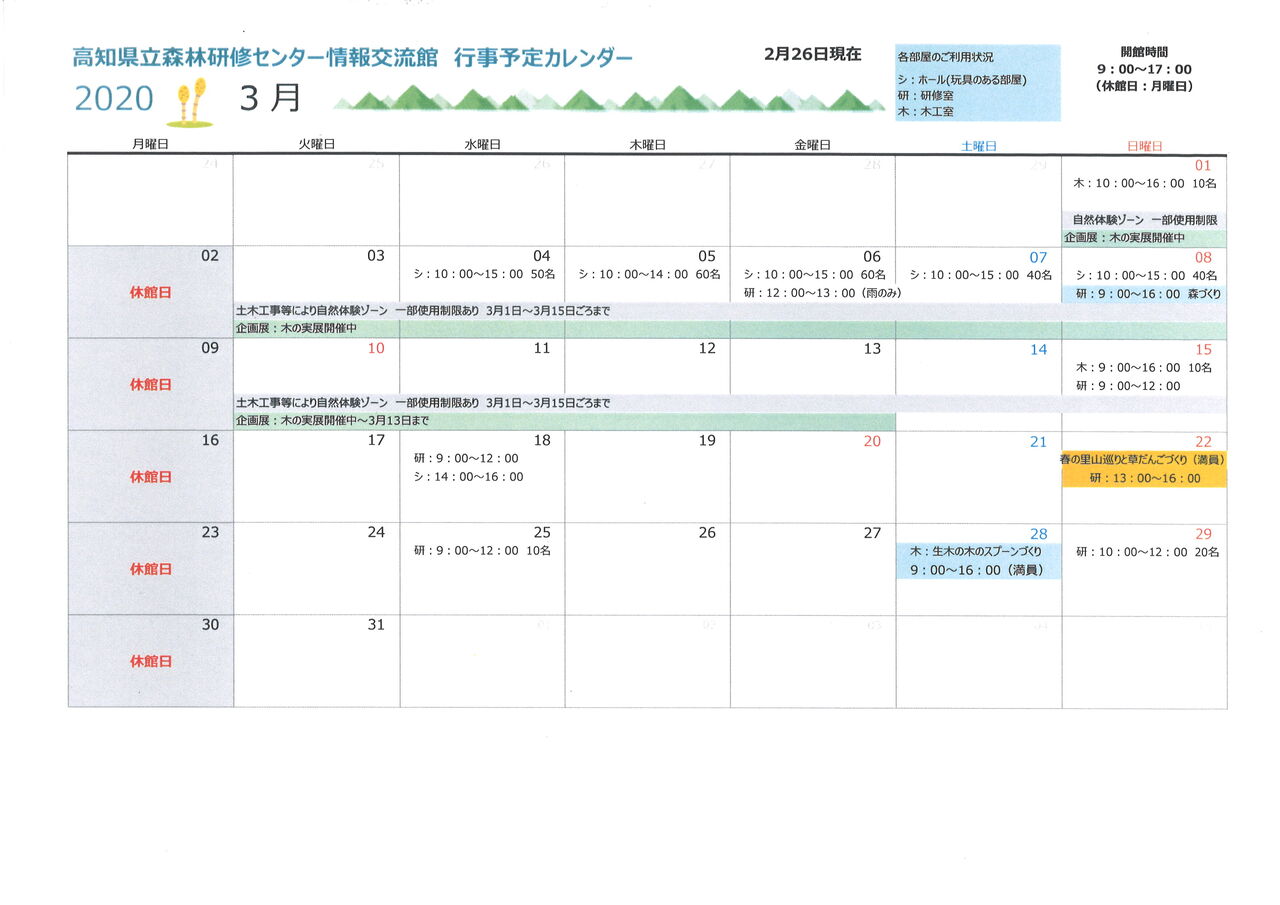 2020年2月と3月の行事予定カレンダーを掲載します。